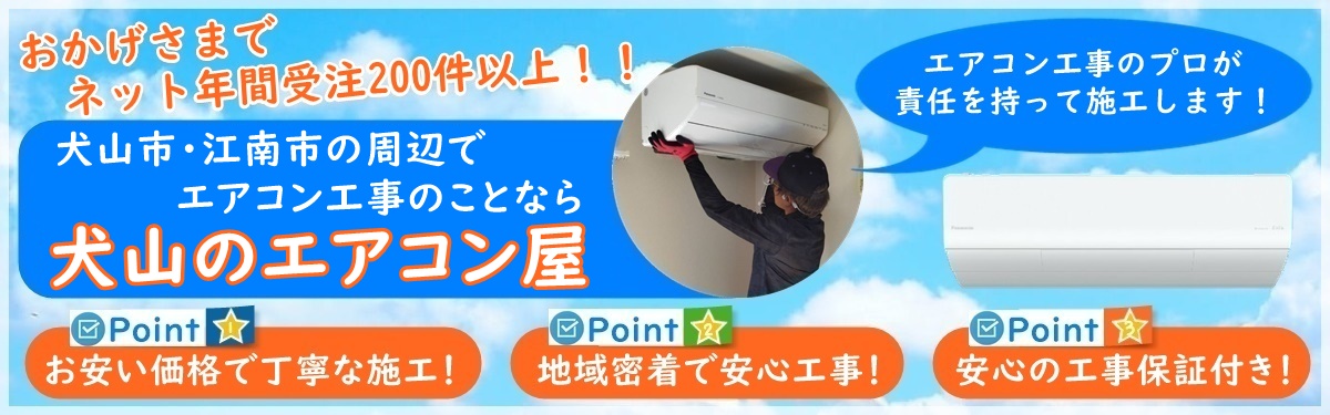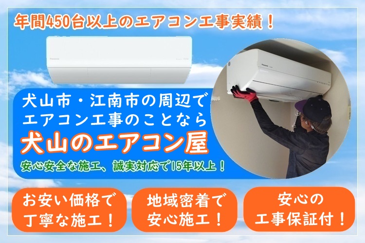犬山のエアコン屋は家庭用のエアコン工事を主にエアコン取り付け・取り外し工事をおこなっている地域密着のエアコン工事業者で、犬山市を中心に愛知県で活動しております。